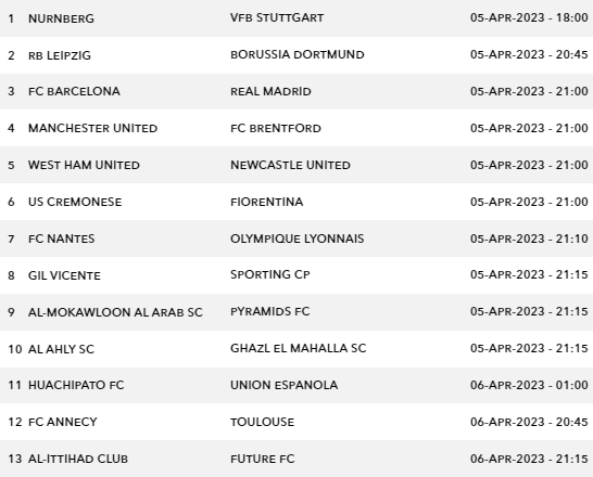 Sportstake 13 Fixtures -Wed 5 Apr